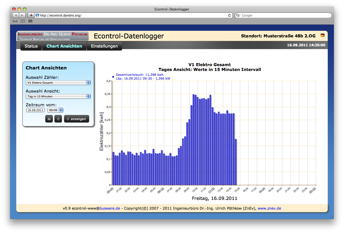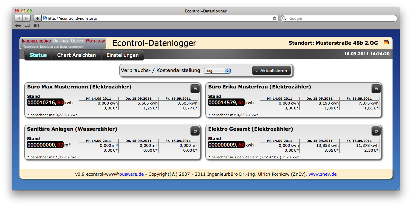 supported devices- Electricity: Power meters with S0 Interface- Water: Flow meters with Reed-contact - Radio power meters (with optional radio modul installed) - series: EM1000 and ESA OS- full featured Debian Squeeze - Linux 2.6.31ScreenshotsThis simple demo is included when shipped.Availability/PriceMOQ: 50 - B2B sale only - lead time: 6 weeksThird party software - http://www.s0control.de/This software is going to be installed directly at the logger. There is no additional PC required. You access this frontend using an ordinary web browser.Live demo (in Kiosk mode)